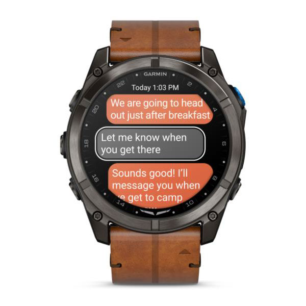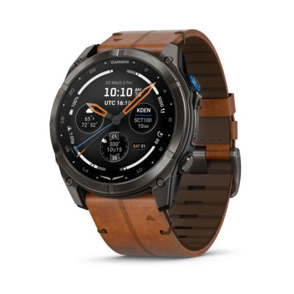 Garmin is pleased to announce the D2™ Mach 2 Pro, the ultimate aviator smartwatch equipped with inReach® technology for two-way satellite and cellular connectivity1 between flights – giving aviators access to text messaging, voice calling, SOS capabilities and more without a cell phone connection. Boasting a sunlight readable 1.4” AMOLED touchscreendisplay, D2 Mach 2 Pro includes a suite of aviation tools including advanced aviation maps, pilot health monitoring features, aviation weather reports, PlaneSync™ compatibility and more. Available in a 51mm case, D2 Mach 2 Pro includes a Carbon Gray diamond-like carbon titanium bezel, Chestnut Leather and Silicone QuickFit® watch bands, built-in speaker and microphone and superior battery life.