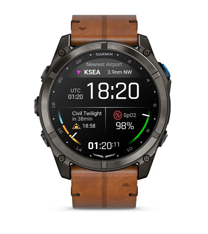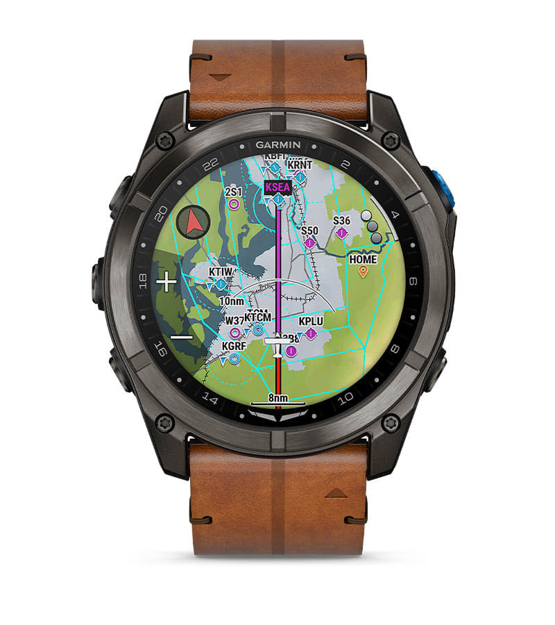 Advanced color moving maps feature airspaces, runways, airports, flight plan overlay and more — offering you the best and most detailed mapping of any Garmin pilot watch to date.